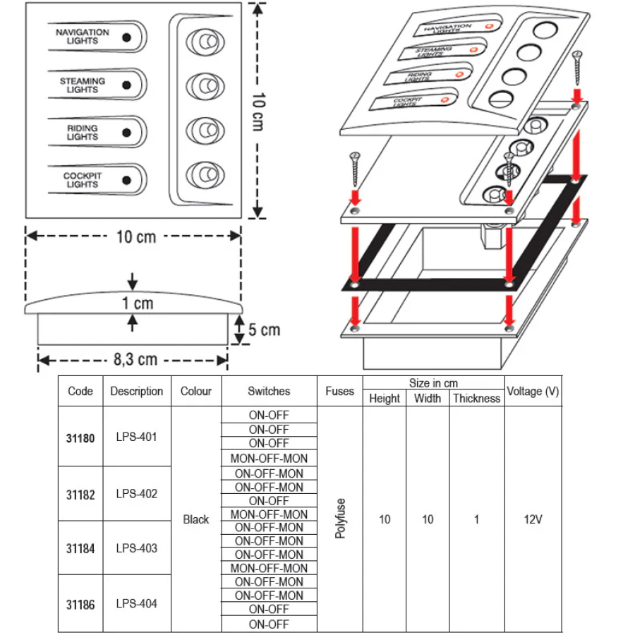 Slēdžu panelis Lalizas LPS-402 31182 12V 100x100x10mm ar parastajiem slēdžiem